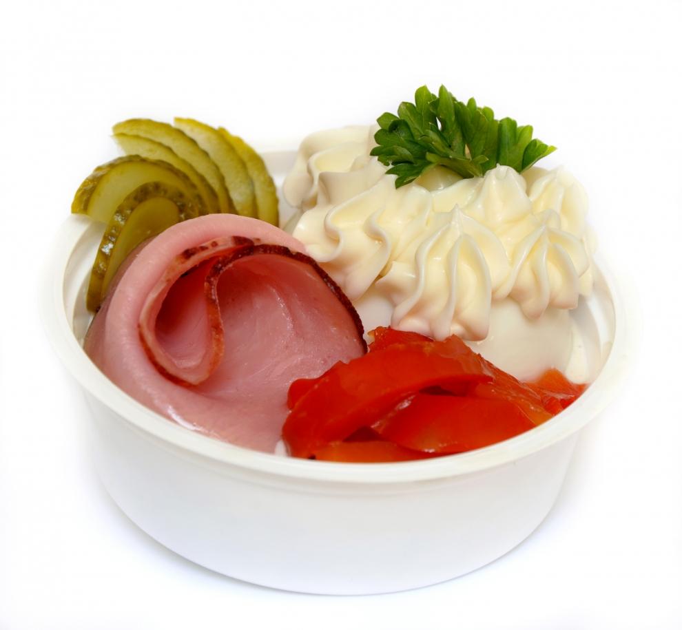 Pařížský salát, vejce, cikánka, sterilovaný okurek, sterilovaná kapie, majonézový přeliv.